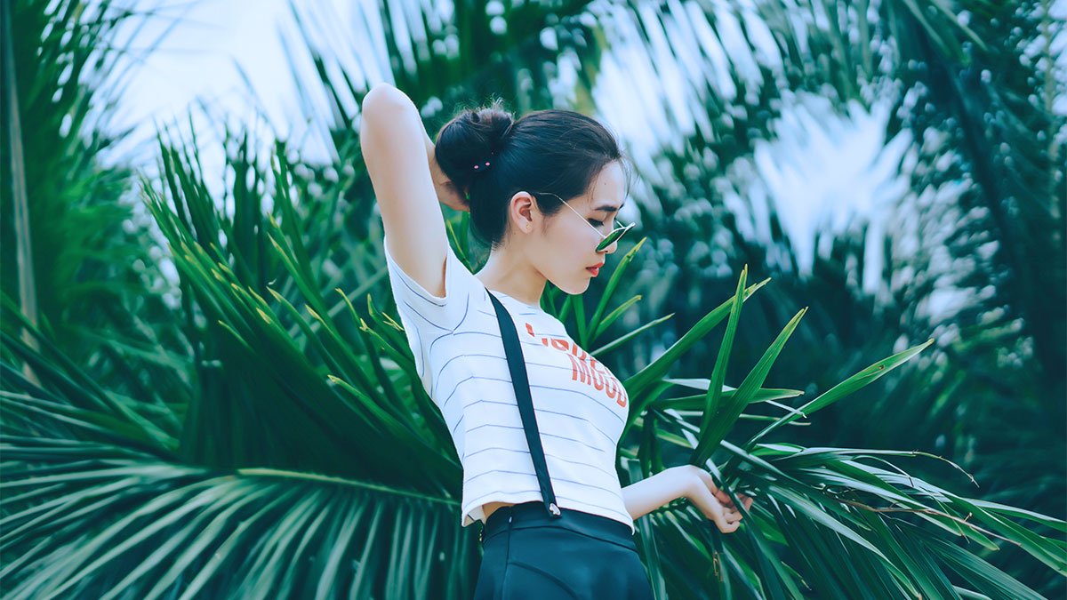 Green leaves photo plant with cute girl modeling